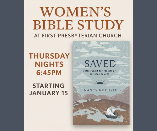Ladies, join us for Women's Bible Study on Thursdays at 6:45PM starting January 15th at FPC! We are beginning a brand new study through the book of Acts using the study "Saved: Experiencing the Promise of the Book of Acts," by Nancy Guthrie. Study books are $8. For more information, contact Kristin Milks at milksfam10@gmail.com.